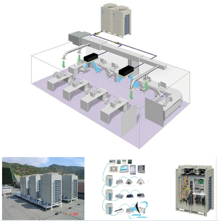 VRV é a sigla de Variable Refrigerant Volume (volume de fluido frigorigéneo variável), também amplamente conhecido na indústria como Variable Refrigerant Flow (VRF). O núcleo é a famosa tecnologia de bomba de calor e inverter da Daikin. Um sistema VRV/VRF continua a ser o único sistema comercial que ajusta continuamente o volume de fluido frigorigéneo no sistema para corresponder exactamente ao requisito de aquecimento ou arrefecimento em cada área, para um óptimo conforto e uma eficiência energética máxima. Empresas como Mitsubishi, Hitachi, Midea além de outros fabricantes top do mercado, tambem desenvolvem esta tecnologia para o condicionamento de ambientes residenciais ou comerciais.