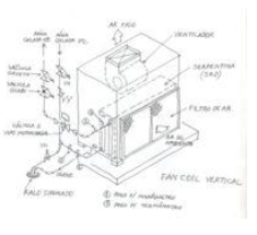 Um sistema Fan Coil Chiller utiliza-se de um fluido intermediário (água gelada misturada com etileno-glicol) para climatizar os ambientes. A água é gelada no chiller situado numa casa de máquinas. A água gelada é circulada por bombas de água gelada (BAG). No chiller, geralmente a condensação do fluido refrigerante é realizada através do uso de água que circula por uma torre de arrefecimento (ou usa condensação a ar para menores capacidades). Os fan-coils recebem a água gelada a aproximadamente 7ºC e a devolve a cerca de 12ºC para o chiller. A potência de resfriamento do fan-coil é dada por Q=m.c. (Te-Ts).